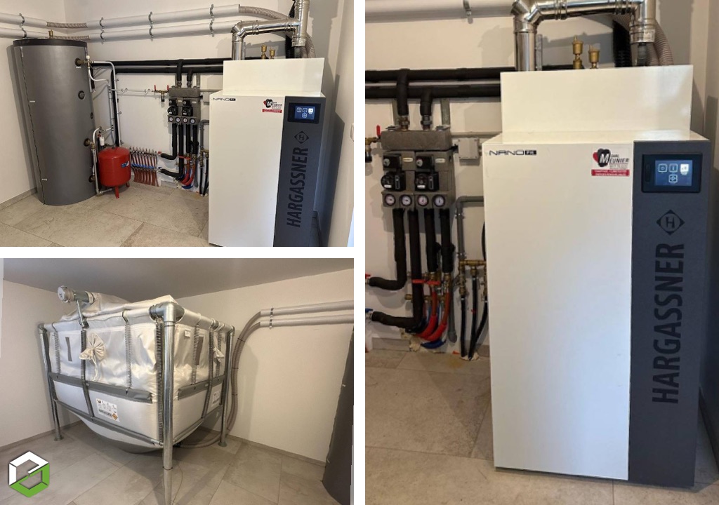 Nous avons ensuite installé la nouvelle chaudière à granulés Hargassner Nano-PK 15, accompagnée d’un ballon tampon combiné avec échangeur solaire en attente d'une futur installation de panneaux solaires.