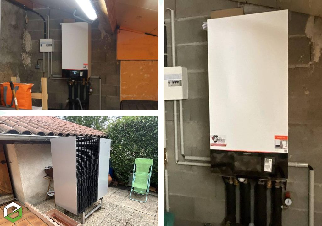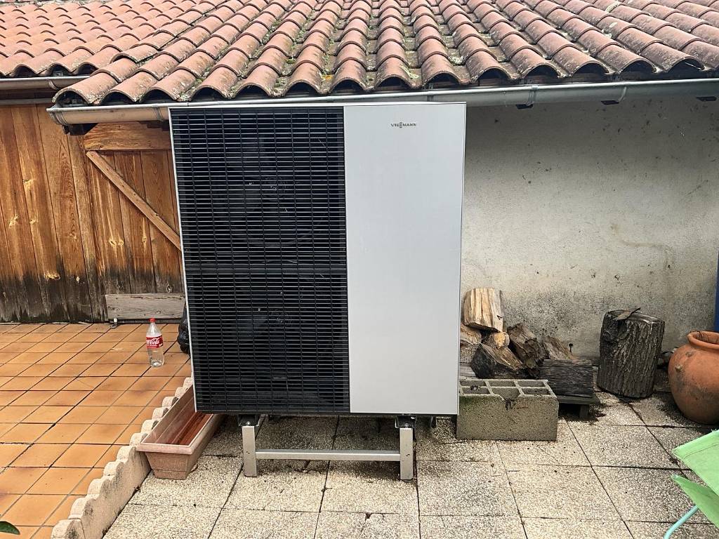 Une pompe à chaleur VIESSMANN 150-A avec création d'une dalle pour supporter la pompe à chaleur extérieur.